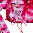 A cute cropped tie dye denim jacket with lace up details and bedazzled buttons. Truly one-of-a-kind and super fun to wear.